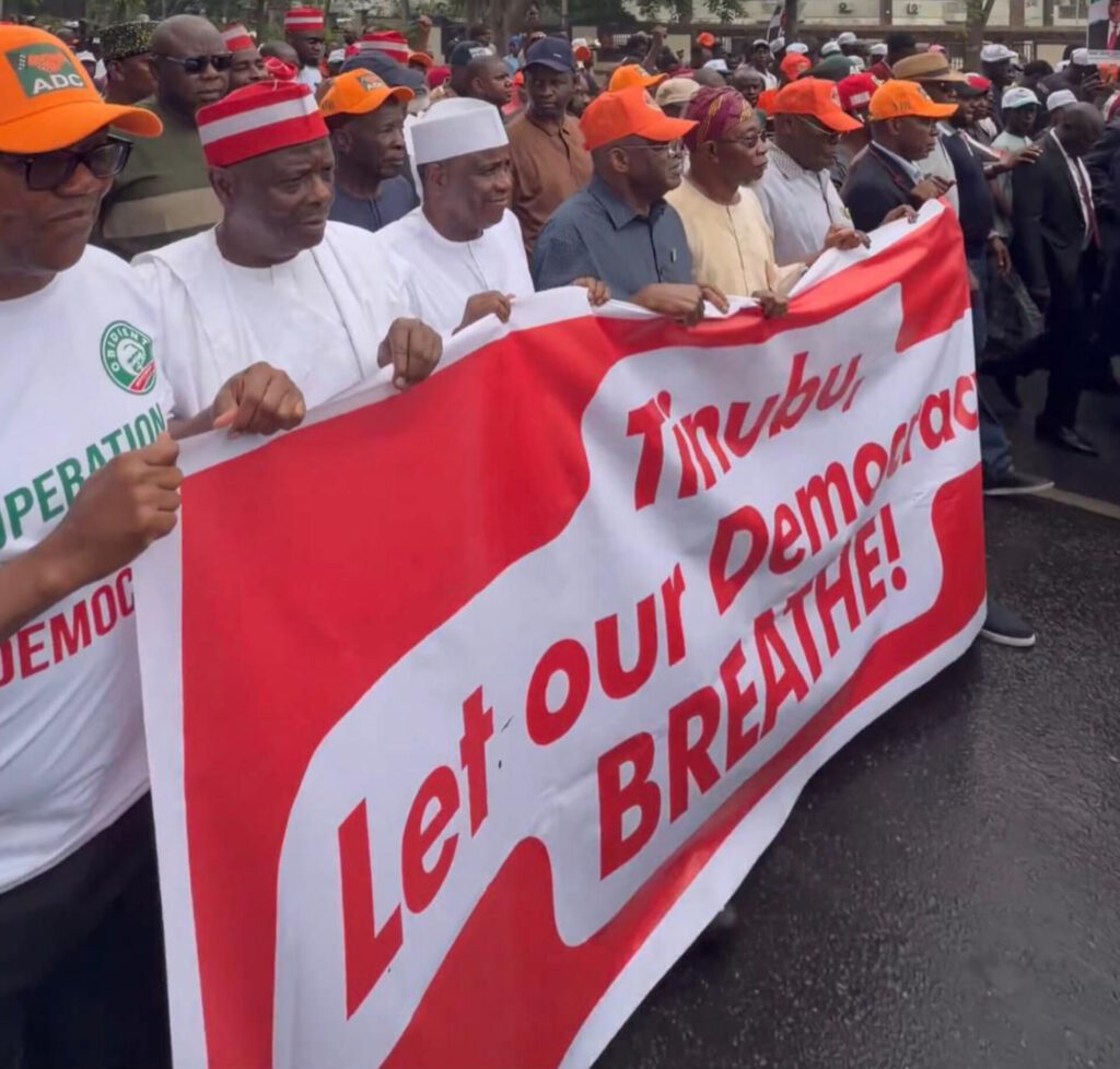 Prominent African Democratic Congress (ADC) leaders, including Rauf Aregbesola, Aminu Tambuwal, Dino Melaye, and David Mark, joined the demonstration.