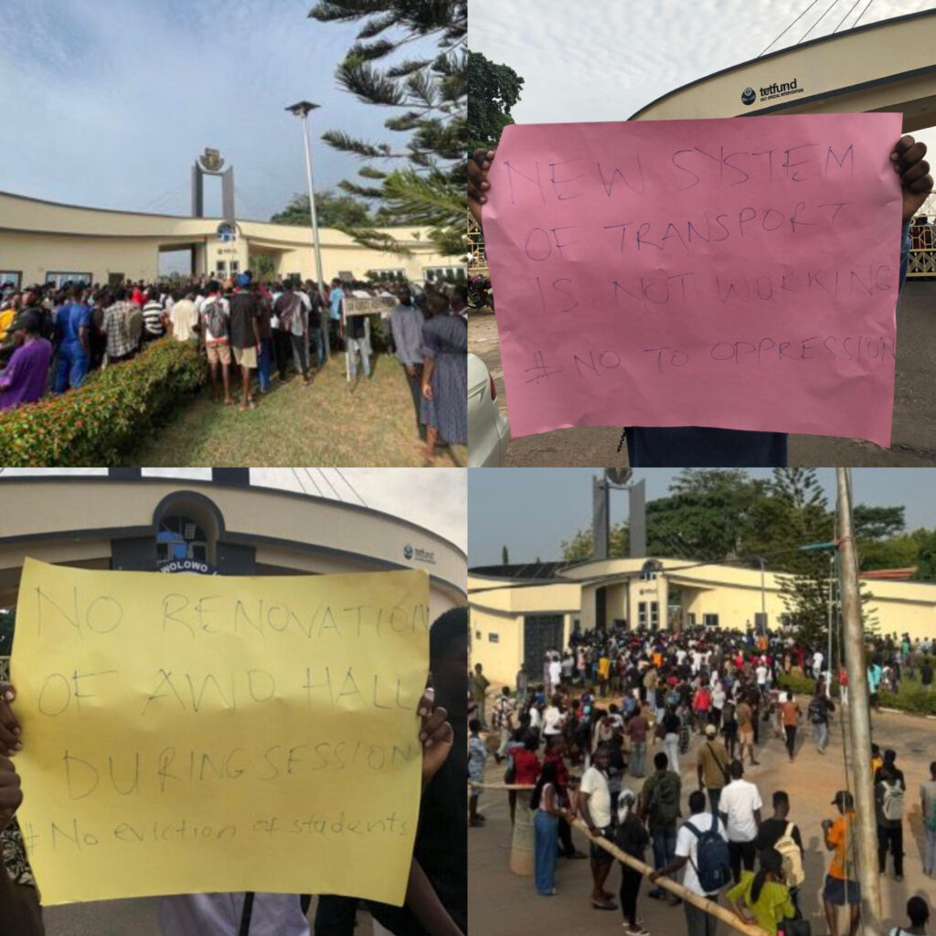 Students of the Obafemi Awolowo University Students’ Union staged a protest on Tuesday at Obafemi Awolowo University, demanding urgent action over welfare and academic challenges affecting their studies.