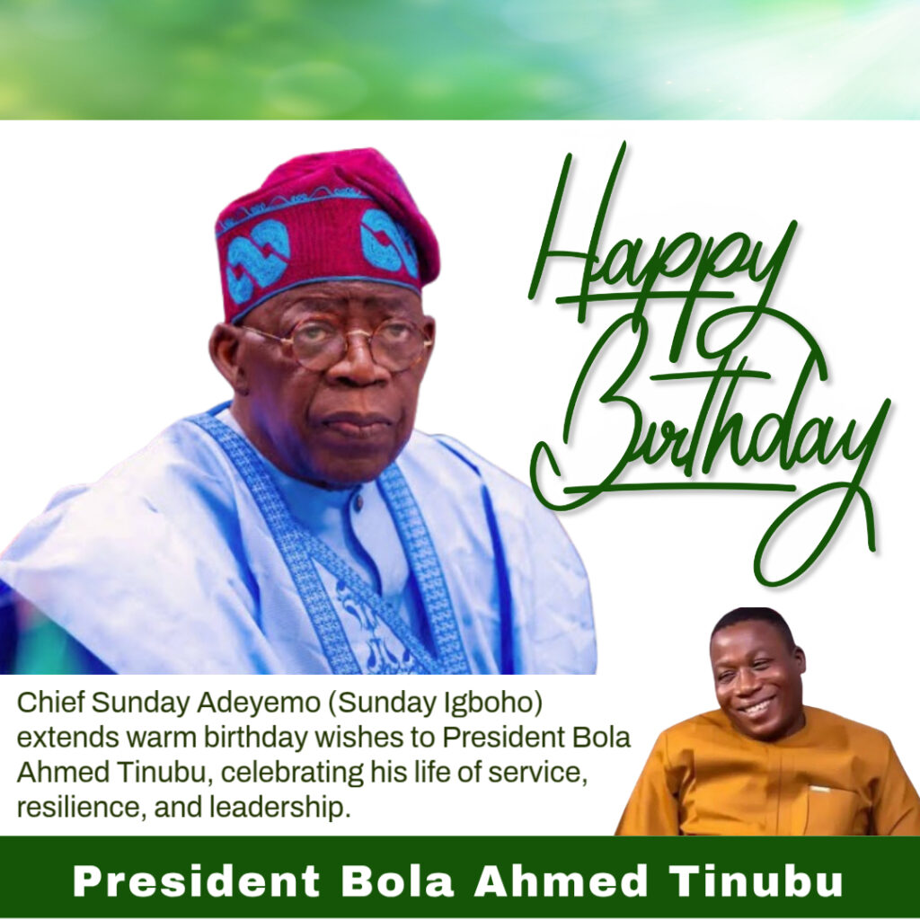 In a message filled with goodwill and statesmanship, renowned Yoruba nation advocate, Sunday Adeyemo, popularly known as Sunday Igboho, has extended heartfelt birthday congratulations to the President of the Federal Republic of Nigeria, Bola Ahmed Tinubu.